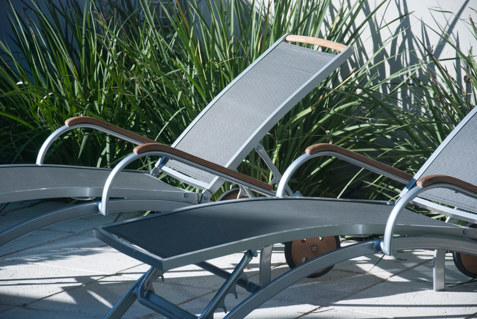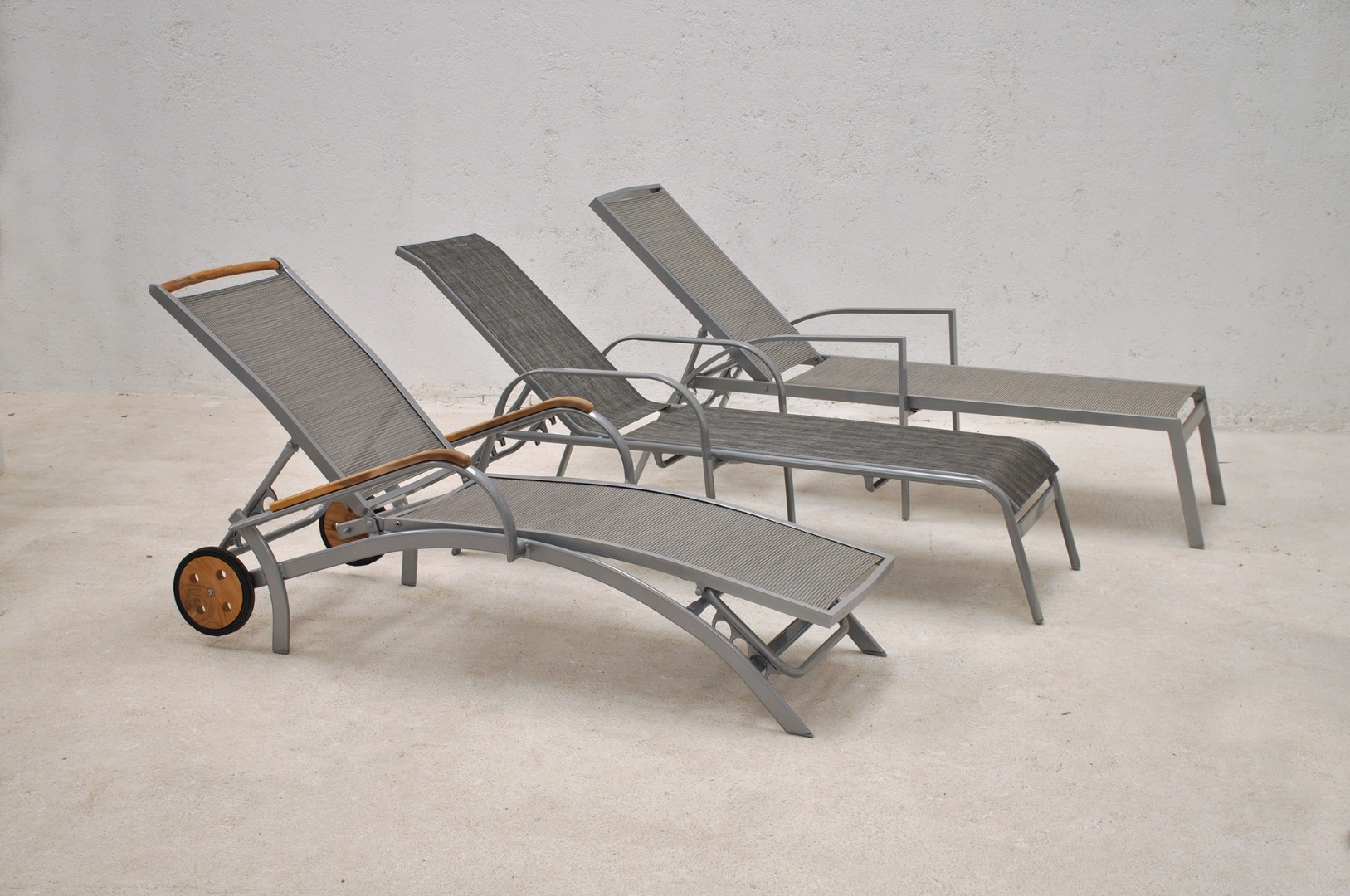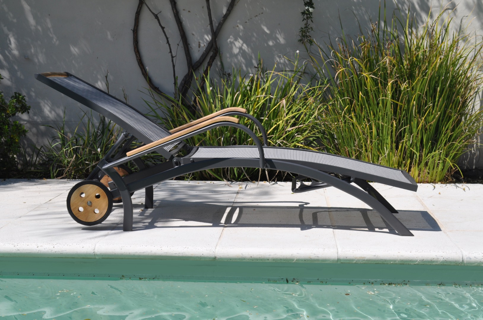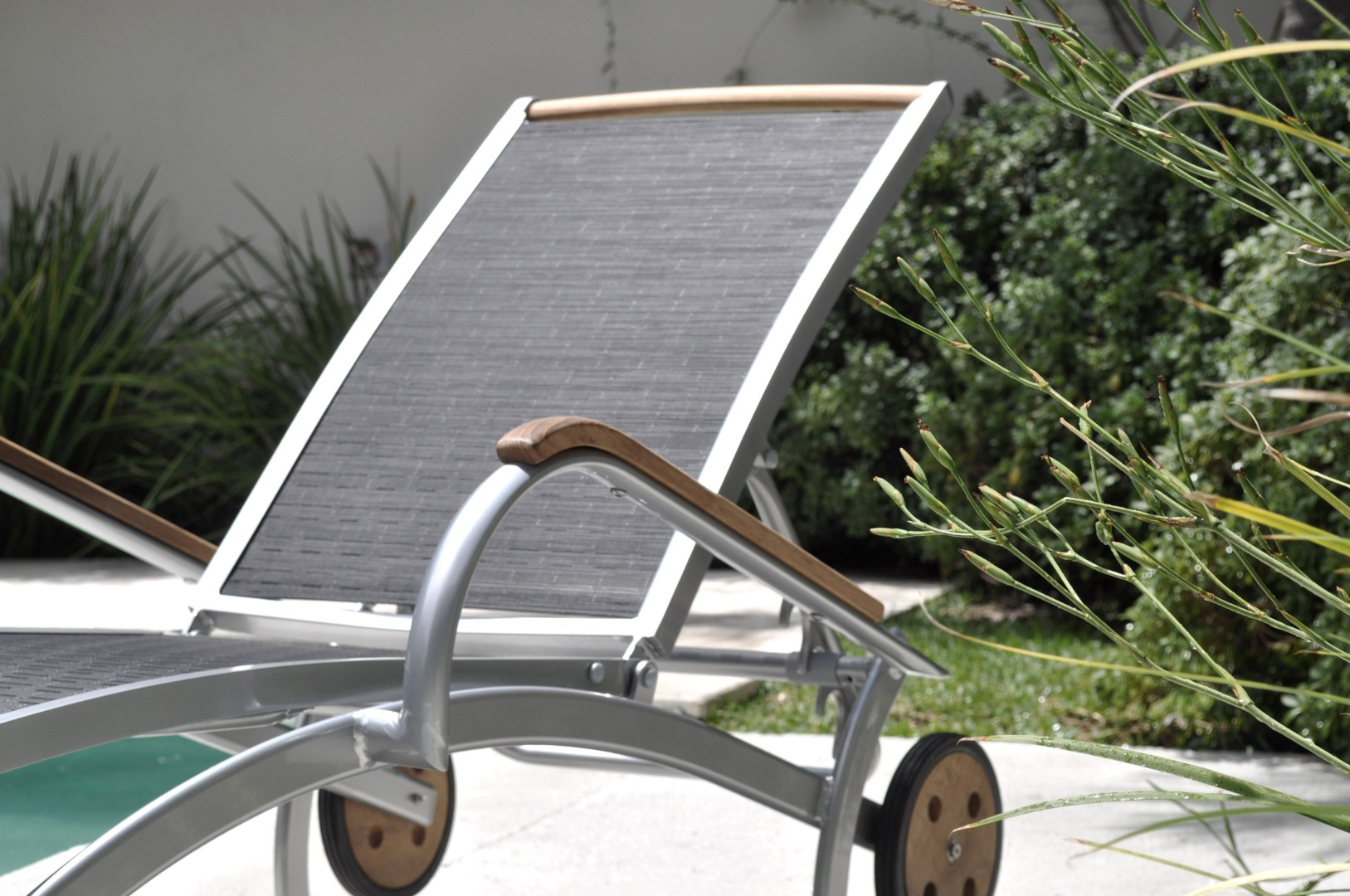 Reposera de aluminio y textilene con apoyabrazos de madera de teca. Ruedas traseras de madera de teca.