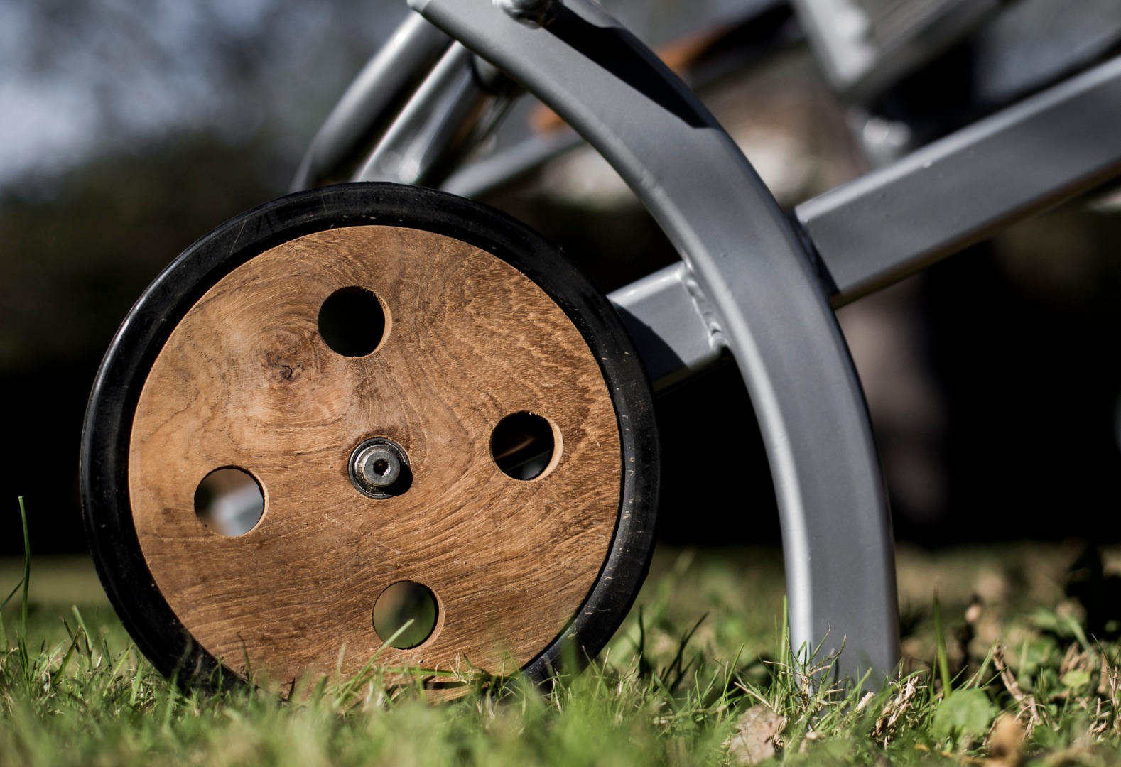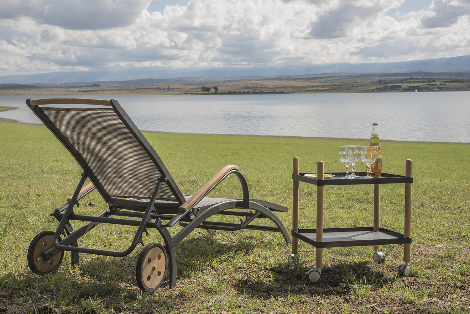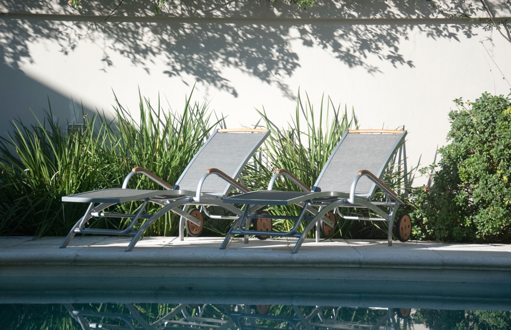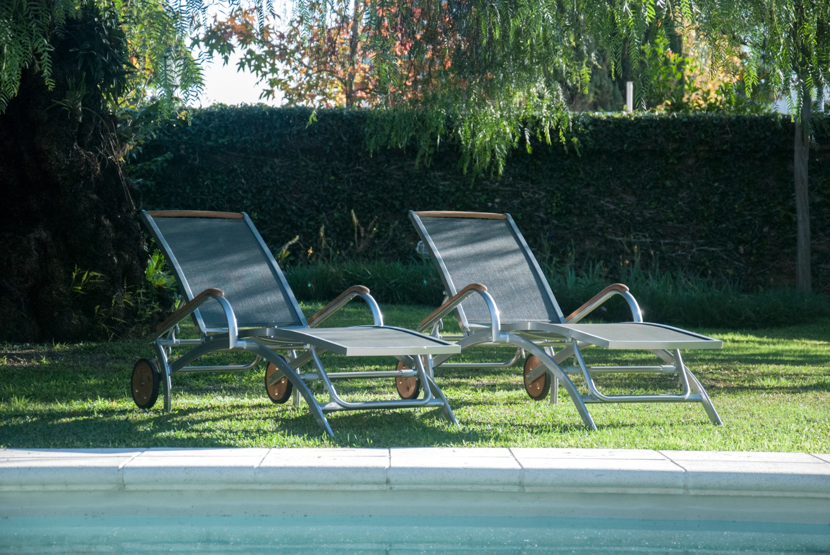 Reposera de aluminio y textilene con apoyabrazos de madera de teca. Ruedas traseras de madera de teca.