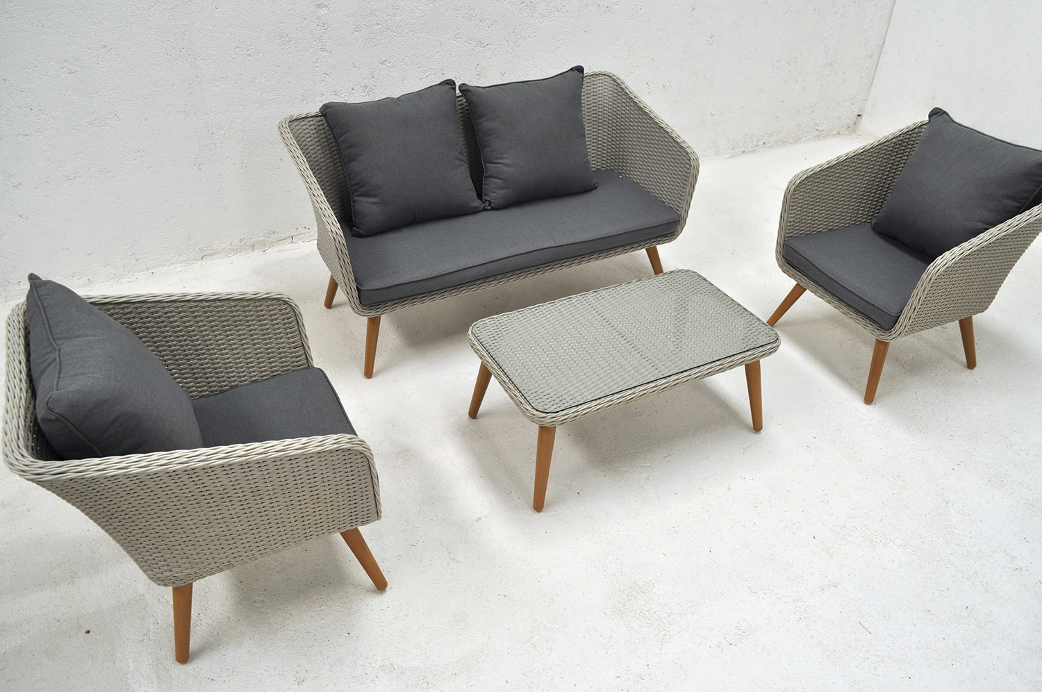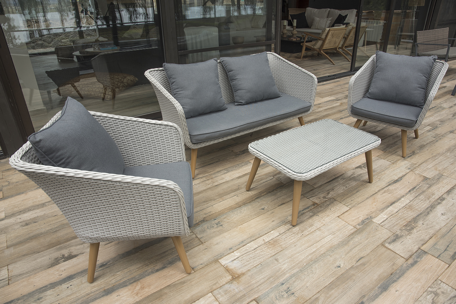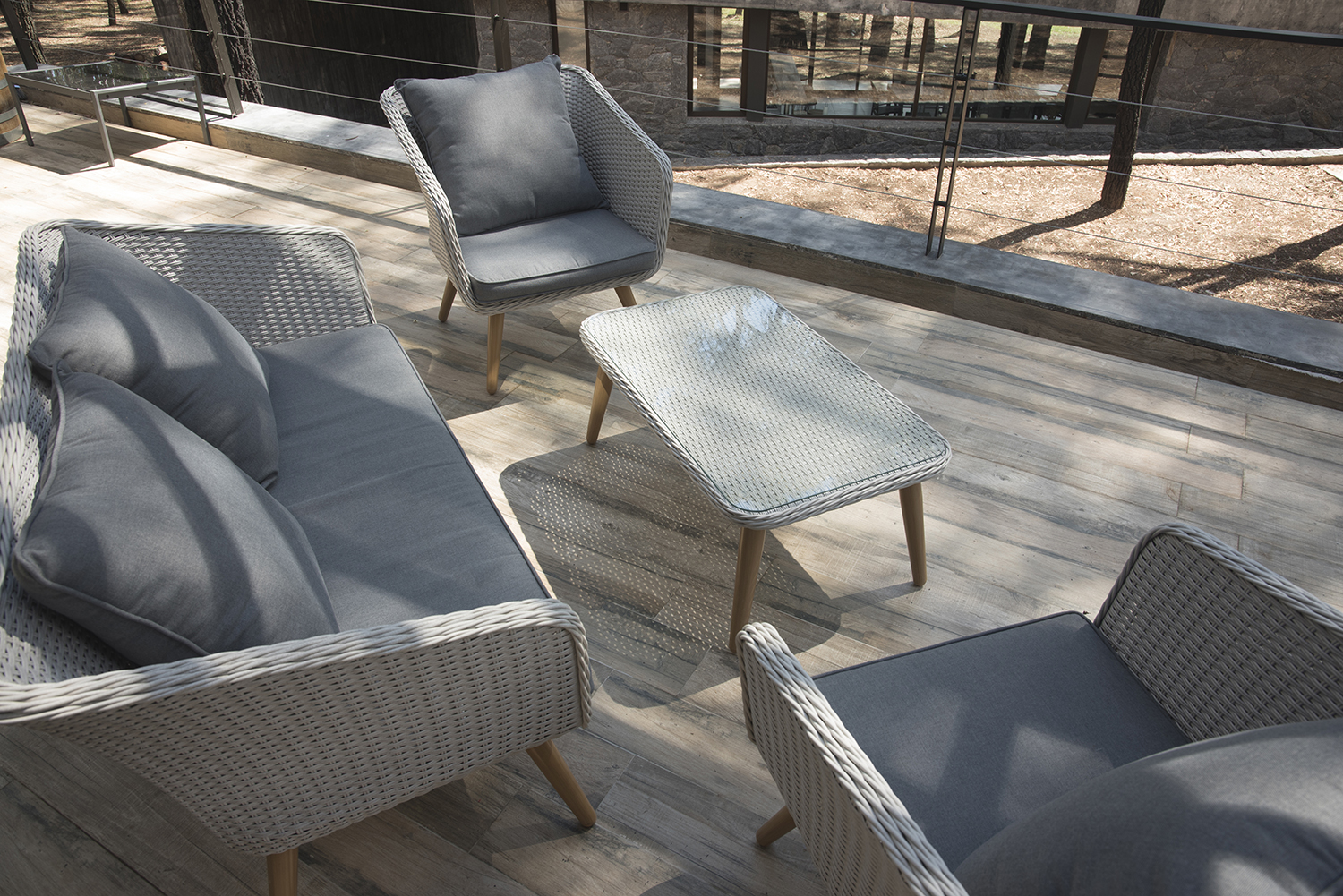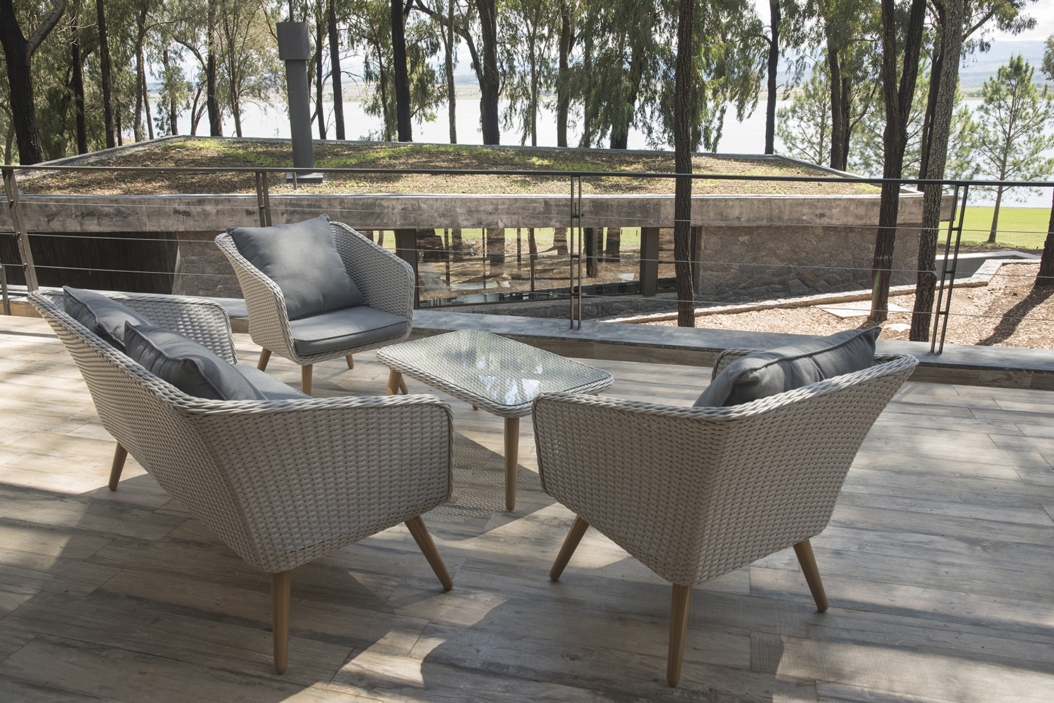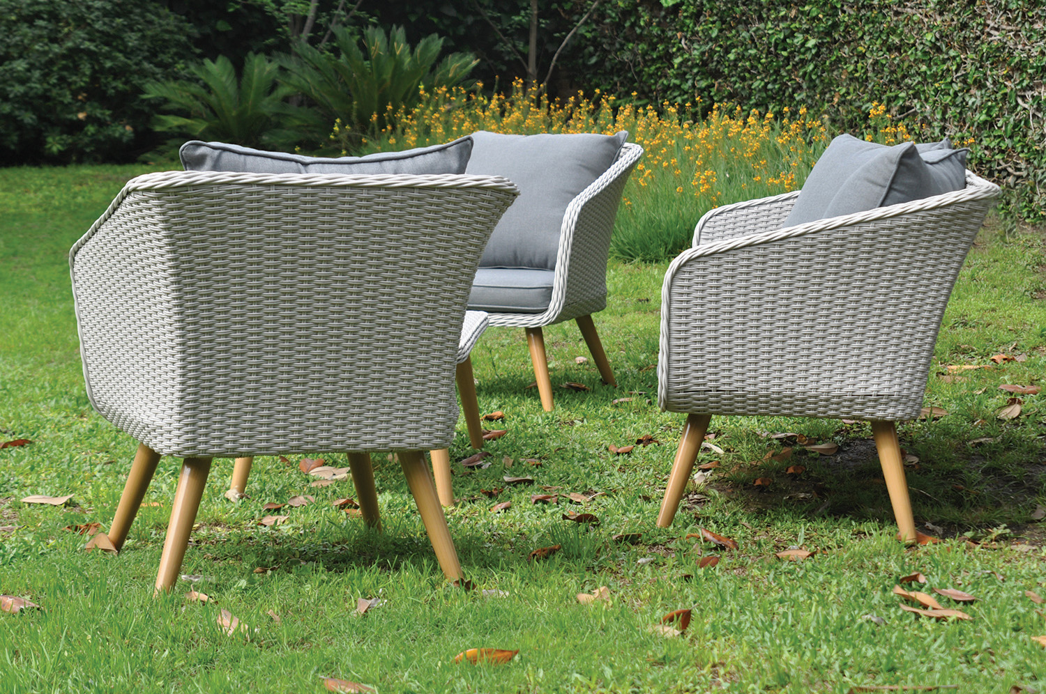 Juego de sillones de aluminio cubierto en rattan sintético con almohadones aptos para exterior.