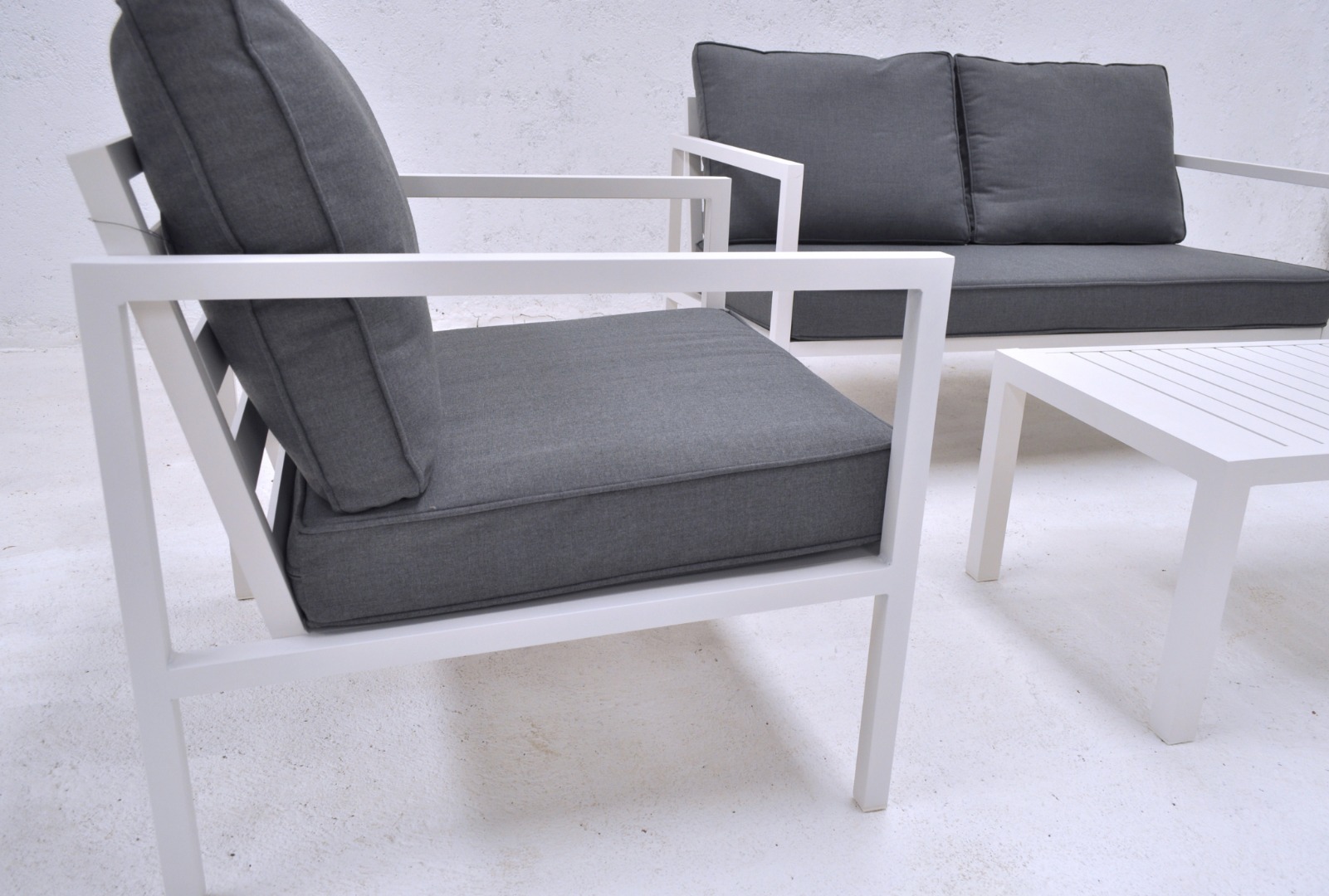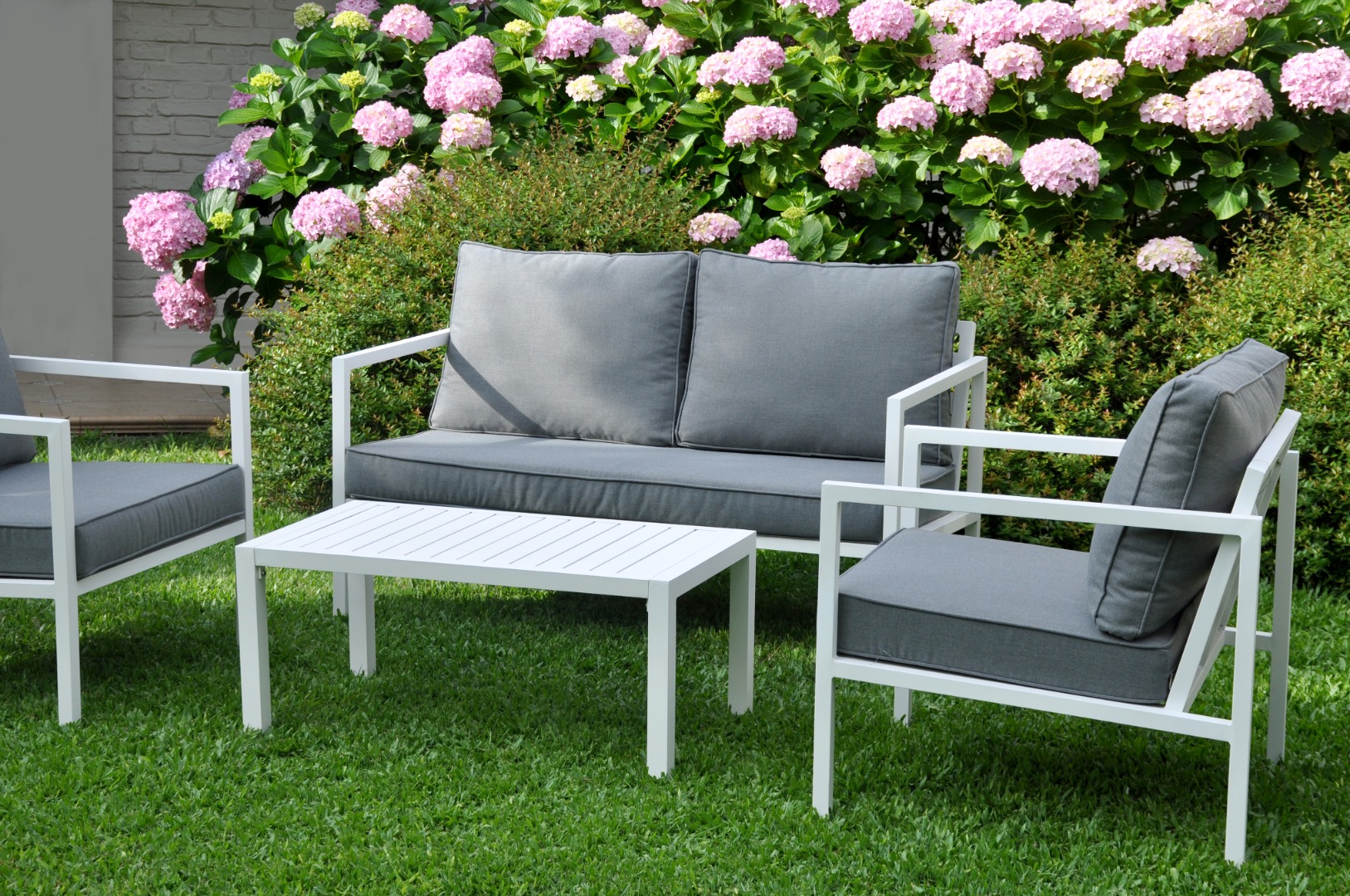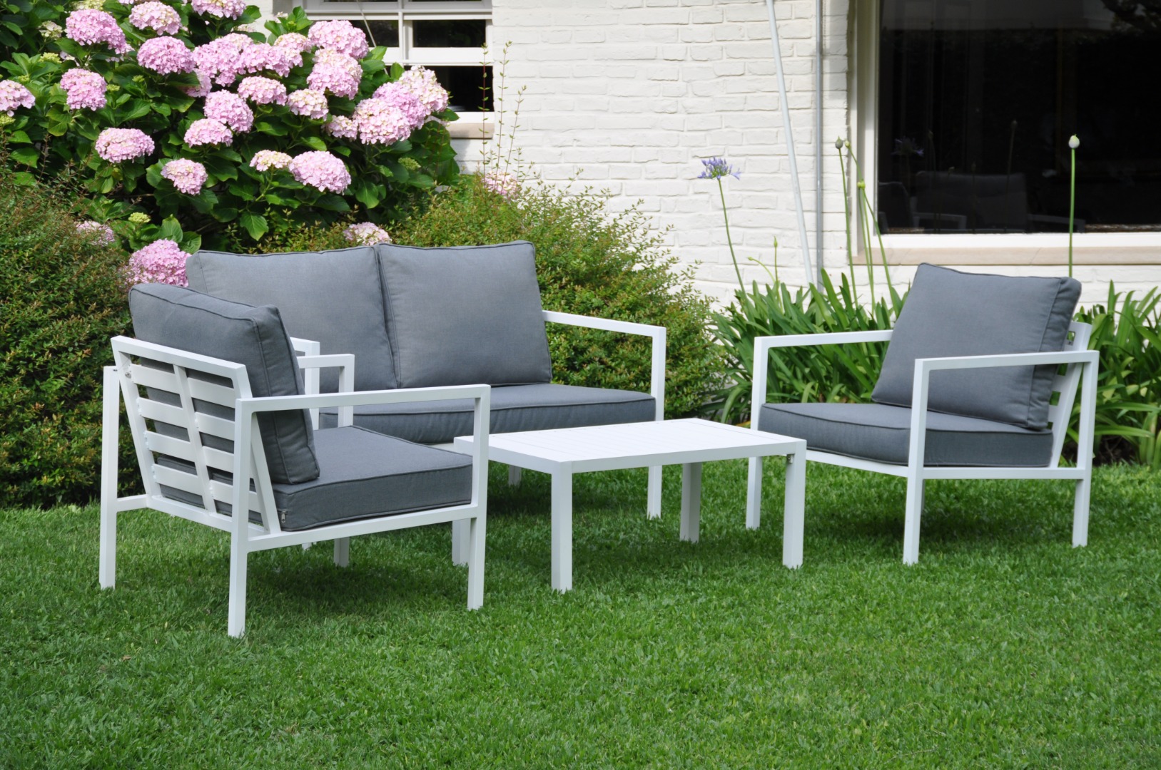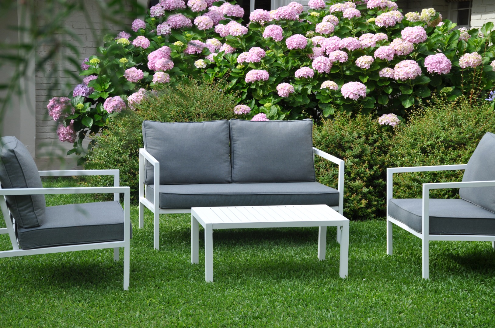 Juego de jardín. Sillones de aluminio con almohadones aptos para exterior.