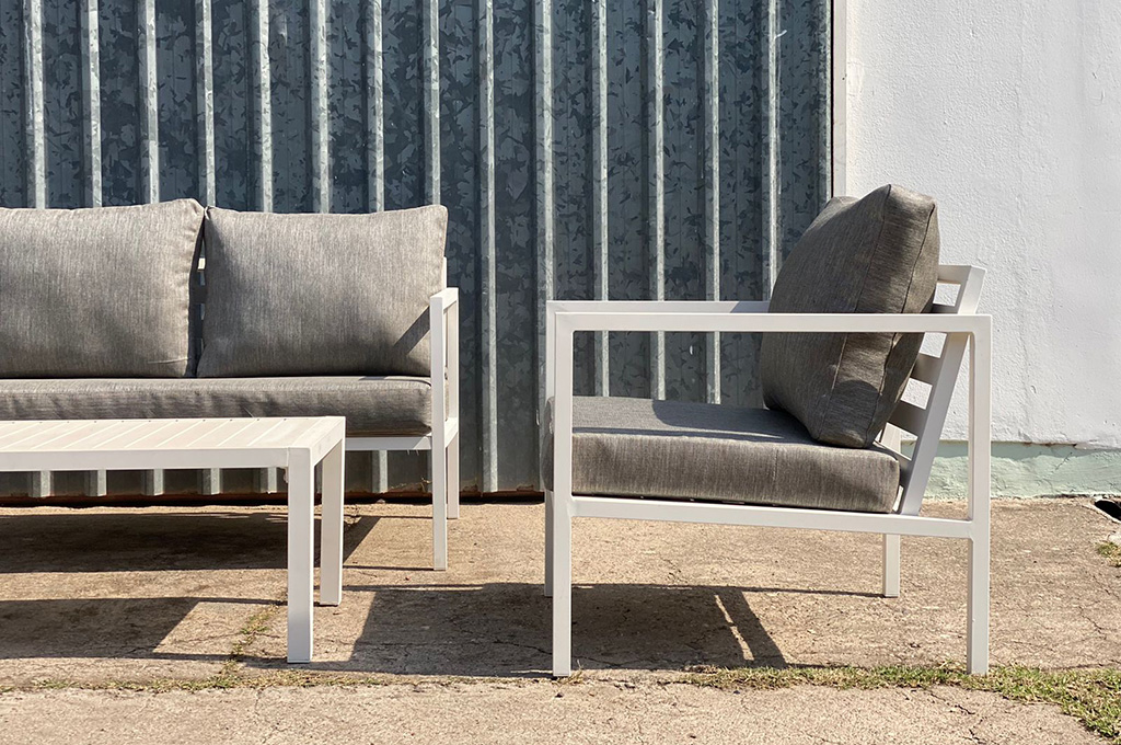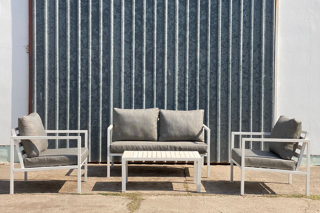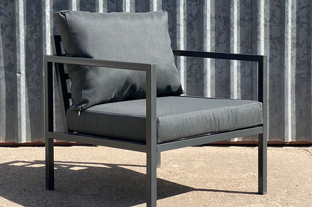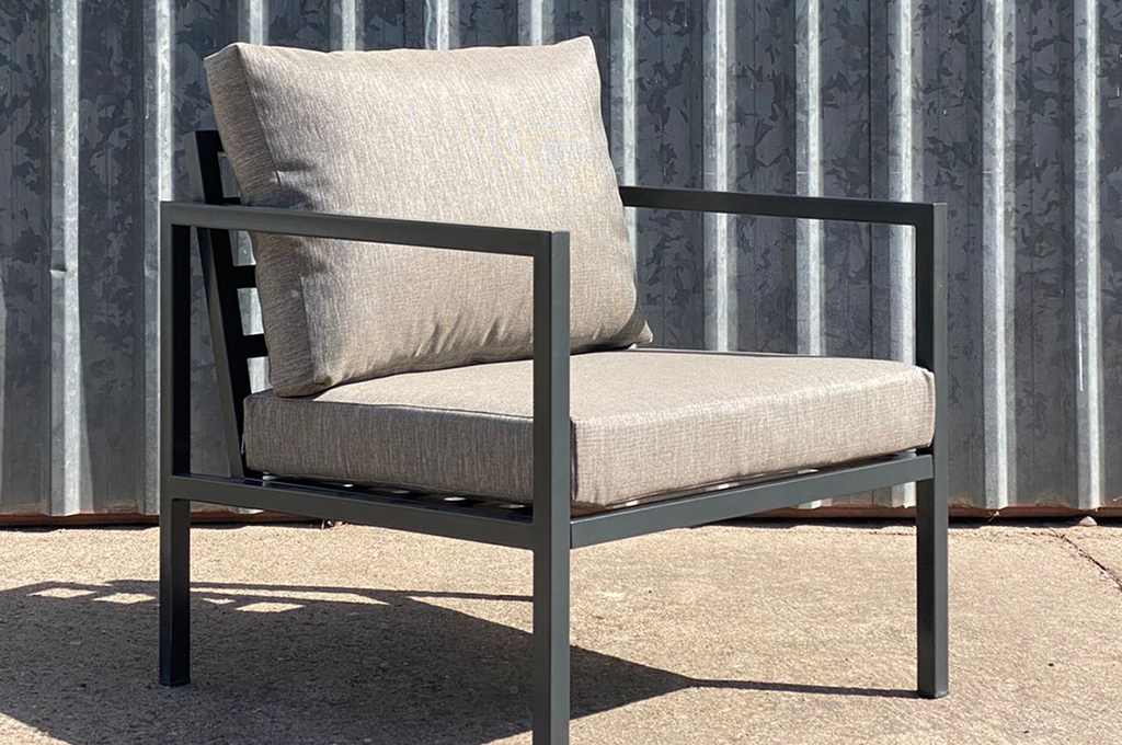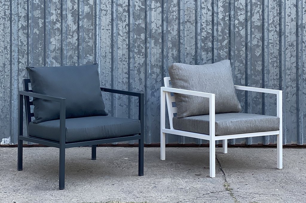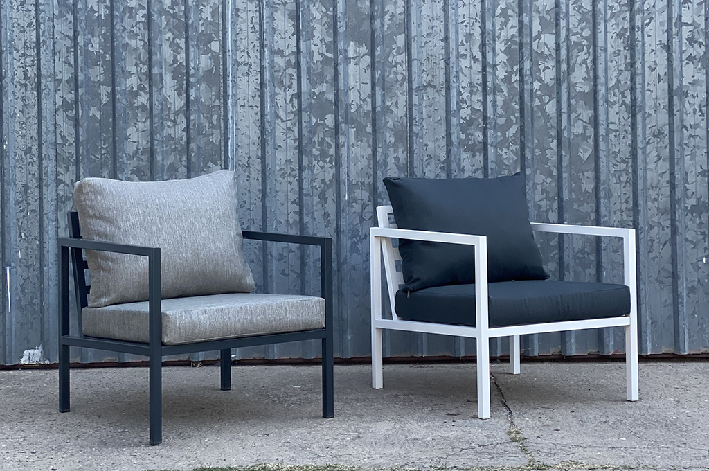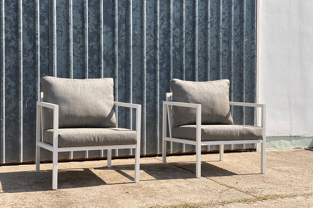 Juego de jardín. Sillones de caño con almohadones aptos para exterior.