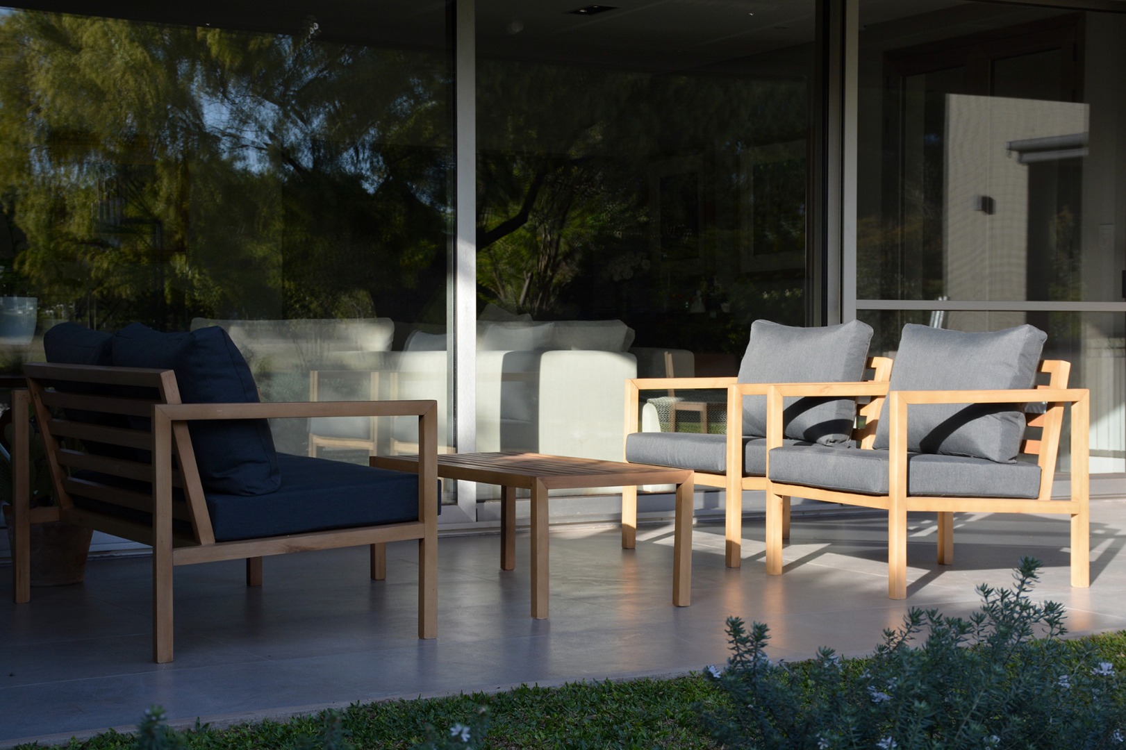 Juego de jardín. Sillones de madera con almohadones aptos para exterior.